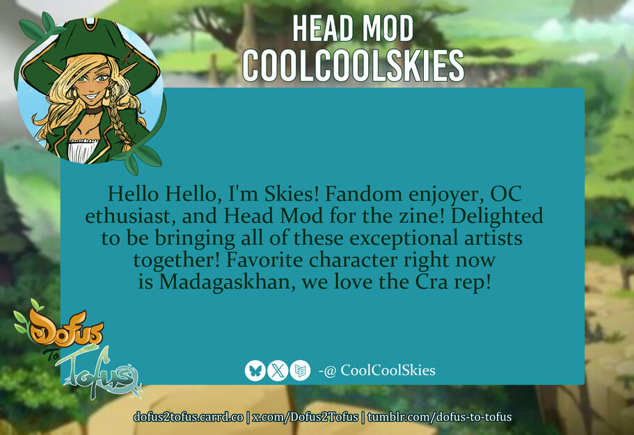 A fanzine dedicated to the multimedia franchises, Dofus and Wakfu! Two beloved series come together as one in this zine to be celebrated and cherished.Artists, writers, and creators alike are welcome to join us in showing what we love most from the series! Be it the Primordial Dragons and Gods of old, the sprawling city of Bonta and their Boufbowl Champions, or the humble beginnings of the Brotherhood of Tofu, we are delighted to see what comes together!This will be a fan contribution zine, with a free release. Please be sure to support our contributors and throw love their way! They'll be dedicating their time, art, and love to this project!
